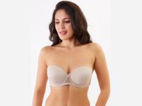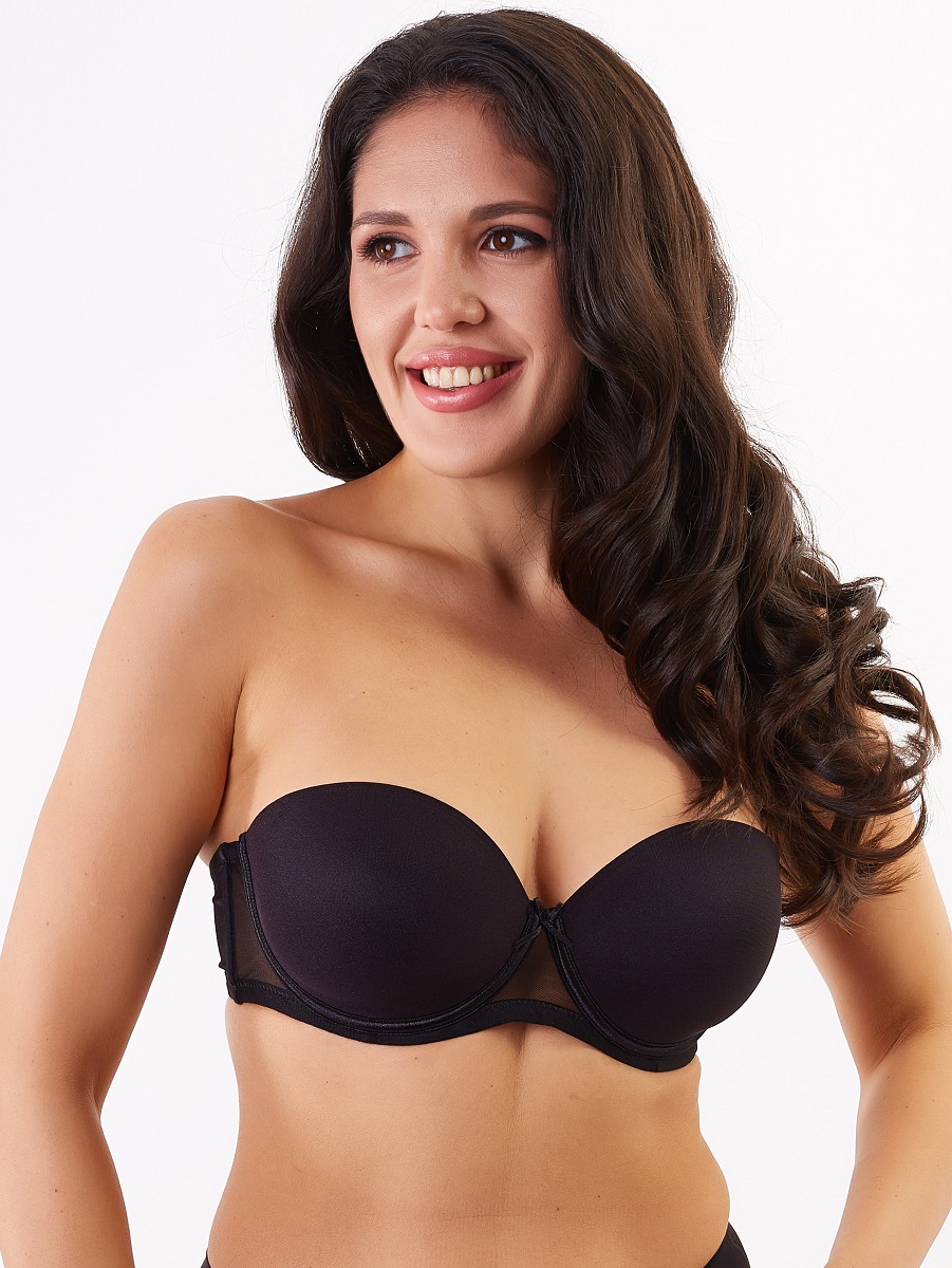 Бюстгальтер-балконет Esmeralda с гладкими формованными чашками на тонком поролоне, на каркасах. Дышащий гипоаллергенный вспененный наполнитель чашек не деформируется. Силиконовые ленты на боковых панелях позволяют носить бюстгальтер без бретелей. Вертикальные косточки в боковых панелях препятствуют скручиванию.