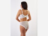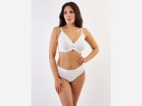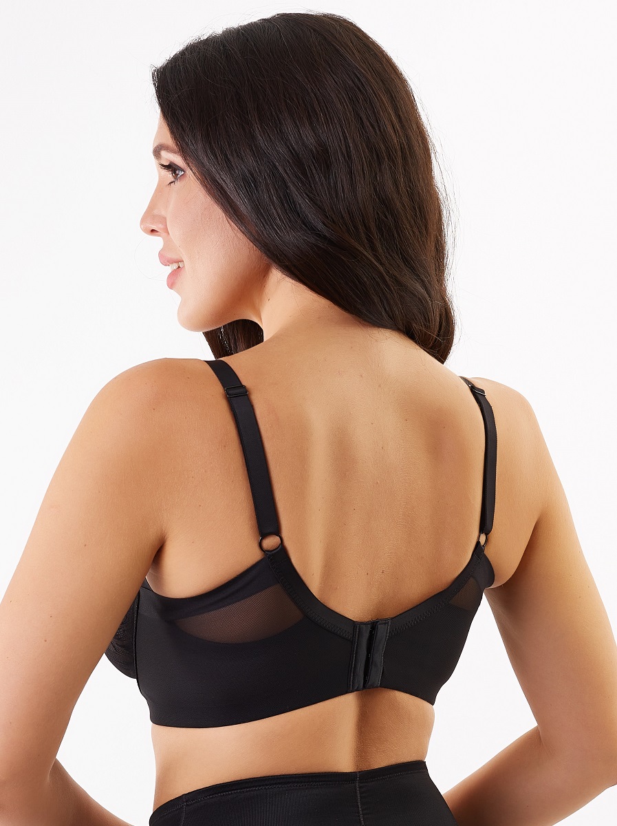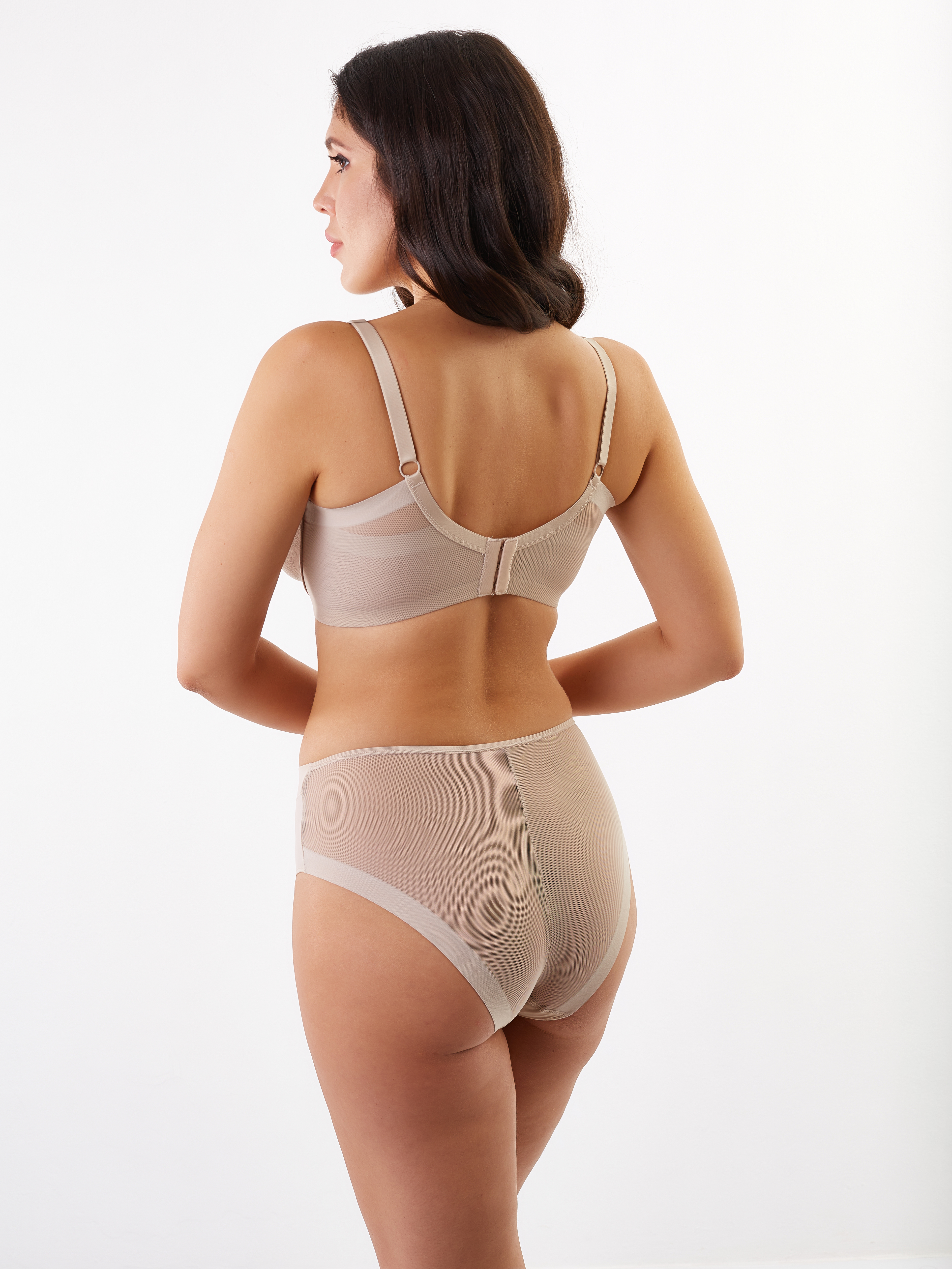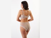 Бюстгальтер Frida с мягкими 2-х слойными молдированными чашками на каркасах, для женщин с «пышной» грудью. Чашки, с дополнительной внутренней боковой поддержкой в области проймы, выполнены из высококачественного гипоаллергенного материала и декорированы гладкой тканью с жаккардовым орнаментом. Бюстгальтер хорошо поддерживает грудь и придает ей округлую форму. 2-х слойные боковые панели внахлест выполнены из полупрозрачной ткани в сетку, с бесшовными краями по технологии лазерного среза. Широкие панели сглаживают и уменьшают неровности боковой зоны. Бесшовный пояс обеспечивает идеальное прилегание и комфорт. Спинка с полукруглым вырезом, для усиления поддержки и предотвращения соскальзывания бретелей с плеч. 4-х рядная застежка на 3 крючка. Бретели с пониженной растяжимостью регулируются сзади.