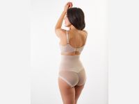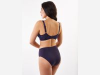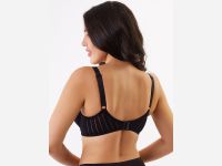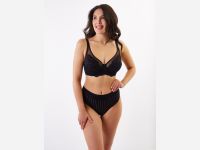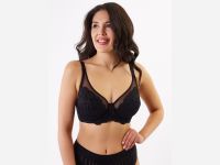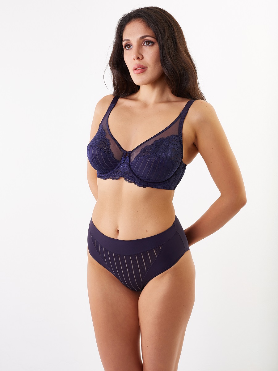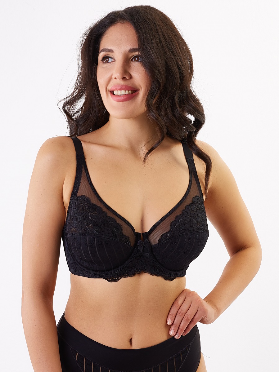 Классический бюстгальтер с мягкими кружевными чашками, на каркасах. Двухсекционные чашки с диагональным швом выполнены из трикотажного жаккарда и кружева. Глубокие чашки на широком соединении собирают грудь с боков, моделируют и поддерживают. Подкладка в нижней части чашек препятствует деформации и растяжению. Закрытые чашки по линии декольте отделаны эластичной тесьмой, для более плотного прилегания. Они переходят в малорастяжимые расширенные бретели, с регулировкой на спинке. Широкие боковые панели с вертикальными косточками, предотвращающими скручивание. 4-х рядная застежка на крючках.
