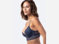 Кружевной бюстгальтер с формованными чашками на тонком поролоне, на каркасах, со съемными вкладышами. Удлиненный пояс декорирован широкой кружевной лентой. Регулируемые на спине бретели.