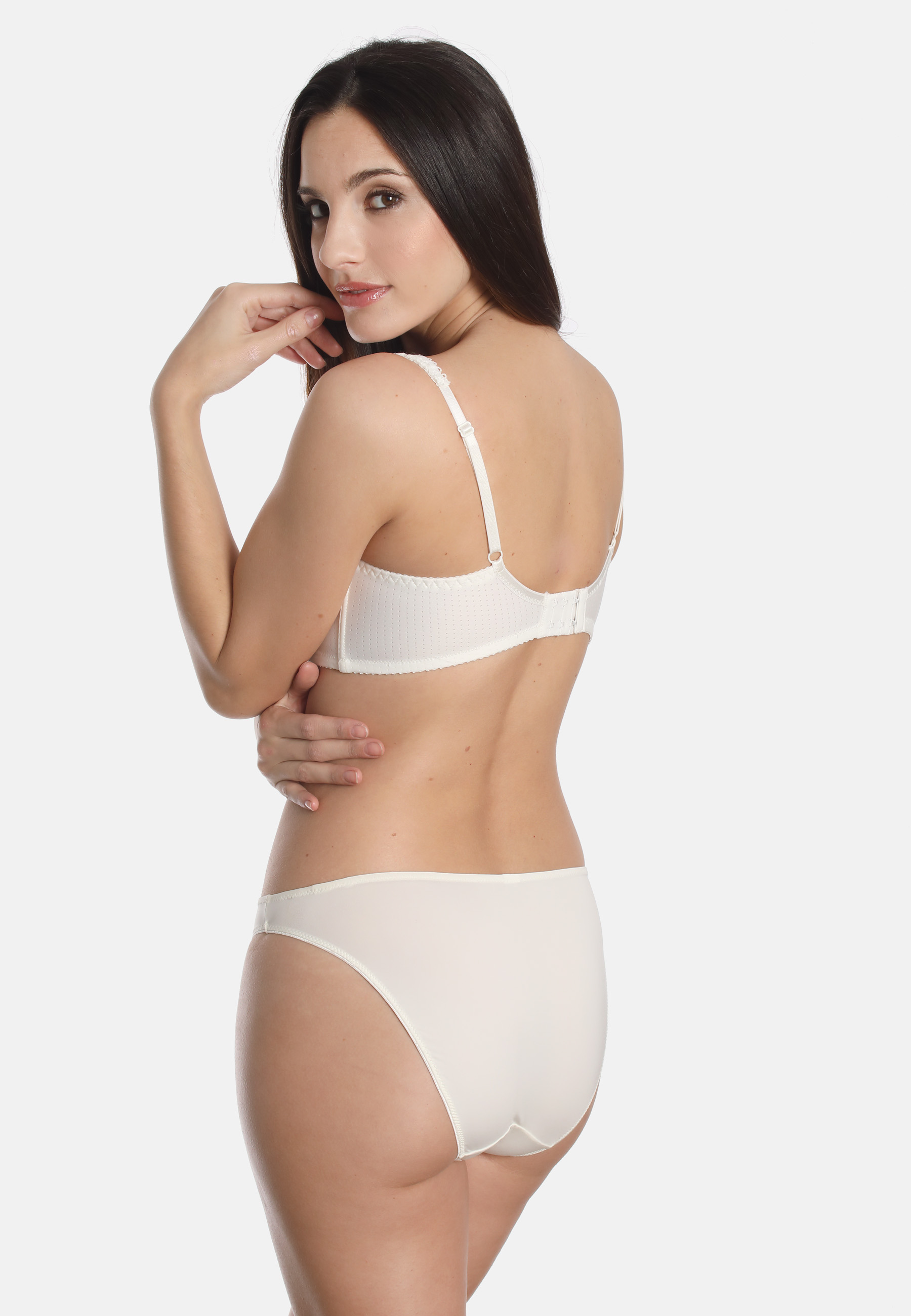 Наслаждайтесь максимальным комфортом и стильной элегантностью с этим классическим бюстгальтером с мягкими бескаркасными чашками. Трёхсекционные чашки на подкладке в виде полумесяца идеально облегают грудь и обеспечивают оптимальную поддержку. Высокая центральная часть и устойчивая функциональная спинка с косточками обеспечивают дополнительную поддержку. Элегантный жаккардовый материал с нежным узором в горошек придаёт бюстгальтеру изысканность, а широкие кружевные бретели не только создают женственный образ, но и мягко снимают давление с плеч. Наслаждайтесь комфортом, который дарит приятные ощущения и выглядит потрясающе.