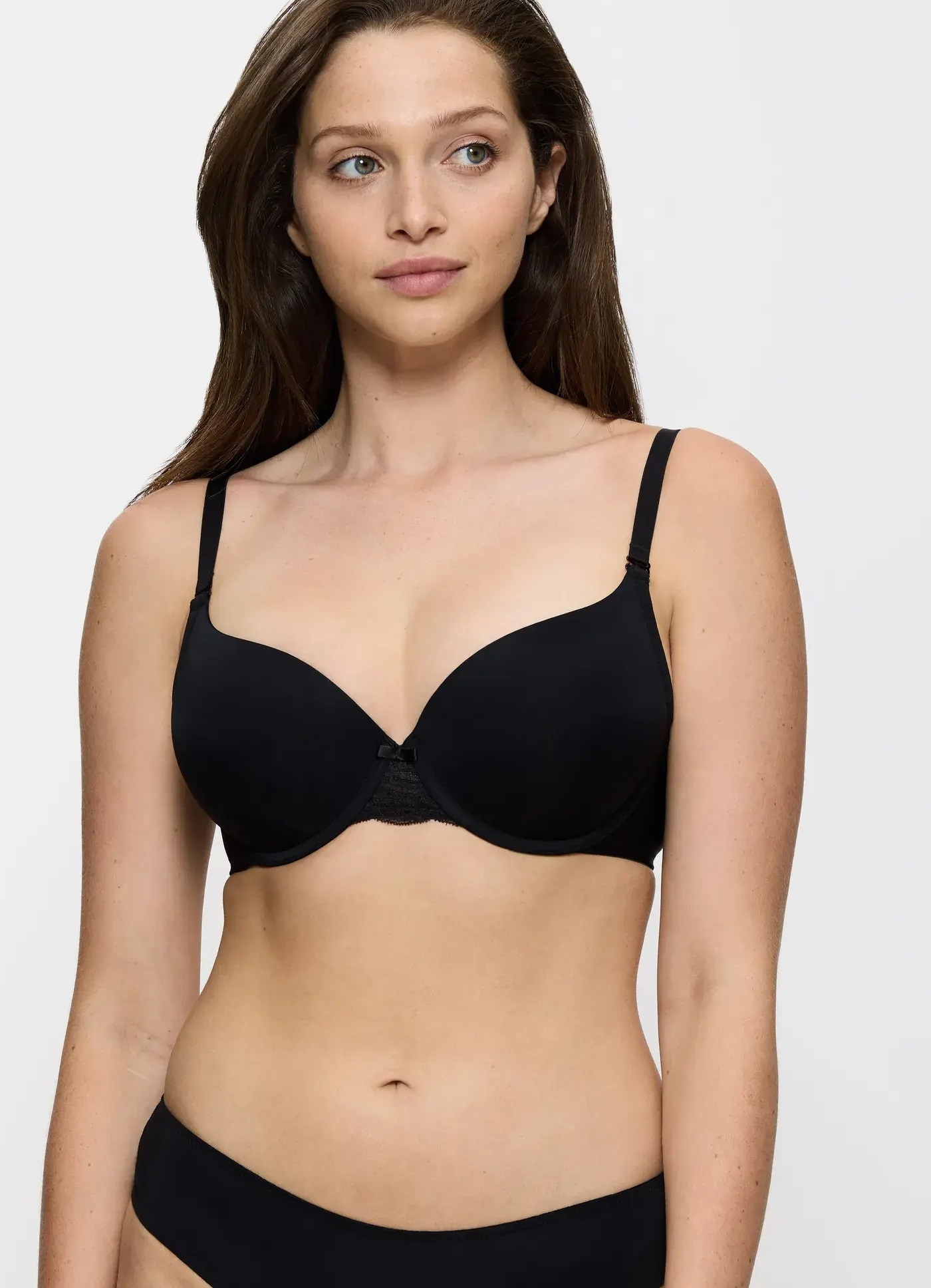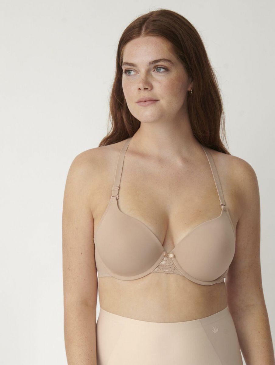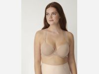 Бюстгальтер декольтированный с формованными чашками на поролоне, на каркасах, серии Lovely Micro WHPM Multiway от Triumph. Чашечки обтянуты гладкой микрофиброй, по центру — изящная кружевная отделка, съемные бретели дают возможность перекрещивания и застежки на шее. Удобная и функциональная модель для повседневной носки.